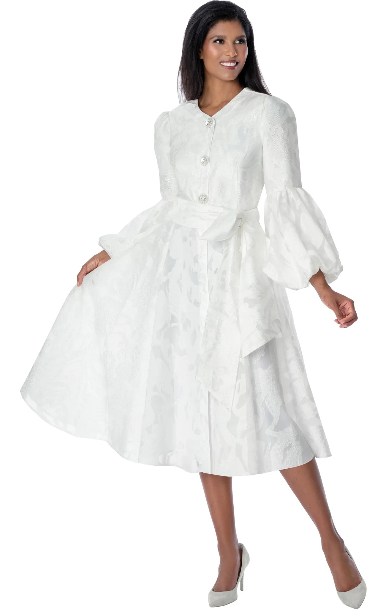 Embrace timeless elegance in this blush pink A-line midi dress designed to flatter and flow beautifully with every step. Crafted from subtly textured fabric with a soft chevron-inspired pattern, this dress features a graceful V-neckline and dramatic bell sleeves that add refined sophistication. The coordinating self-tie waist sash enhances the silhouette, while the delicate floral brooch accent at the shoulder adds a touch of charm. Falling below the knee for modest appeal, this dress is perfect for church services, weddings, afternoon teas, and special celebrations. A polished and feminine choice for any elegant occasion.